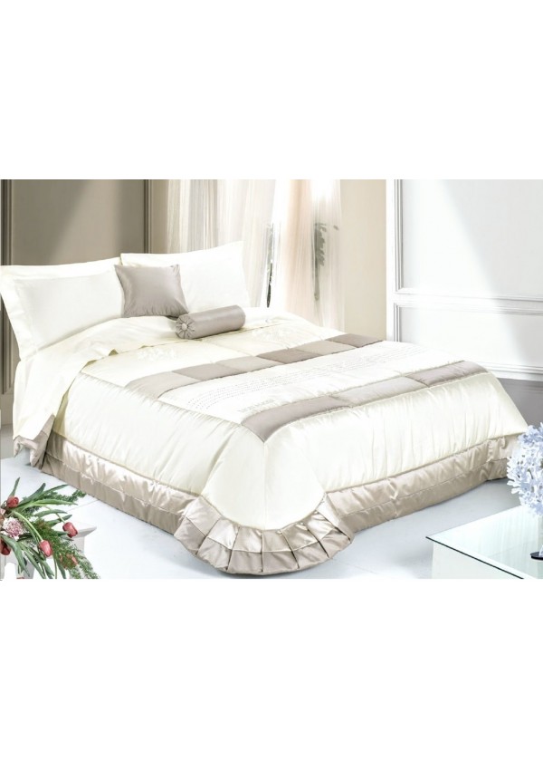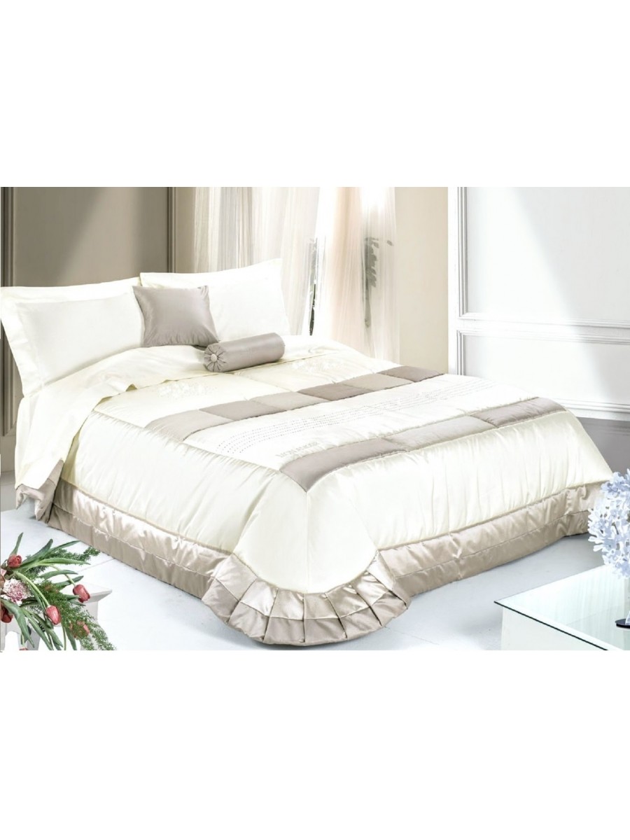 Trapunta matrimoniale di colore avorio e tortora con appliazioni strass. Imbottitura in ppoliestere 350gr. Il tessuto di sopra è in raso di cotone , il tessuto di sotto è in coto e 100%.