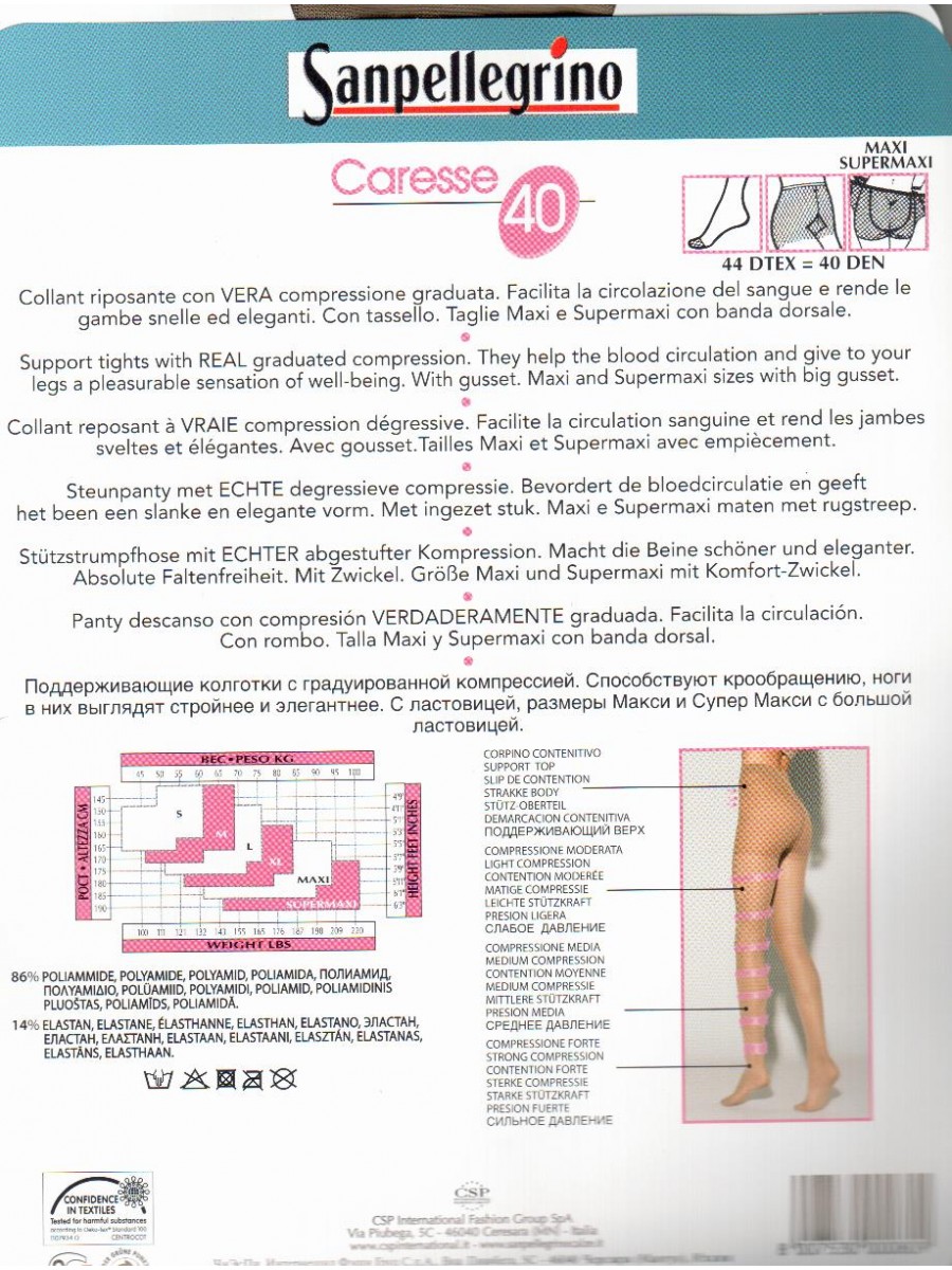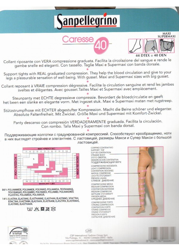 Collant sanpellegrino Caresse 40, riposante velato a compressione graduata. Filato morbido e omogeneo. Favorisce la circolazione sanguinea donando alle tue gambe un beneficio prolungato. Con tassello. Taglia maxi e supermaxi con banda dorsale.